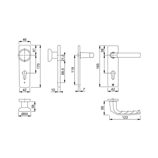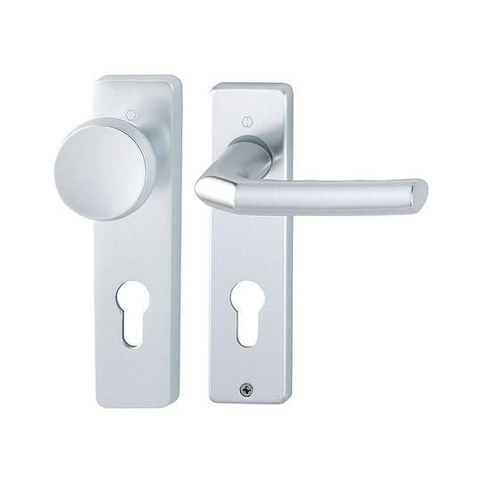 HOPPE Wechselgarnitur Birmingham 54/227K/202KP/AP/1117; Produkttyp: Wechselgarnitur; Produkttyp (Hersteller): Wechselgarnitur; Ausführung: Kurzschild; Befestigungsart: innen sichtbar verschraubt; Befestigungstechnik: ohne Stütznocken; Form: eckig; Vierkant: 8 mm; Material: Aluminium; Form Türgriff (innen): L-Form; Form Türgriff (außen): Flachknopf; Ausführung Türgriff (außen): fest; Gewinde Knopf/Griffplatte: M12; Durchmesser Türgriff (außen): 50 mm; Länge Türgriff (innen): 123 mm; Höhe Türgriff (innen): 56 mm; Höhe Türgriff (außen): 39 mm; Schildbreite außen: 46 mm; Schildbreite innen: 42 mm; Schildlänge außen: 170 mm; Schildlänge innen: 165 mm; Schildstärke außen: 10 mm; Schildstärke innen: 7 mm; Lagerung: wartungsfreies Gleitlager; Einsatzbereich: Objekttür,Wohnungseingangstür; Türart: Vollblatt; Türwerkstoff: Holz,Stahl; Lochung: Profilzylinder gelocht; Entfernung: 72 mm; DIN-Richtung: DIN Links-Rechts; Farbe: silber; Farbton: naturfarben; Oberfläche: eloxiert; Ausführung Vierkant: Rollenwechselstift; Türstärke min.: 37 mm; Türstärke max.: 42 mm