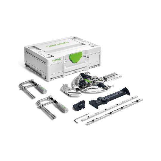 Winkelanschlag FS-WA, 2 Verbindungsstücke FSV/2, Abweiser FS/2-AW, x Schraubzwingen FSZ 120 (2 Stück), Rückschlagstopp FS-RSP, Kombi-Innensechskantschlüssel SW 5/SW 3, Systainer SYS3 M 137, im Karton