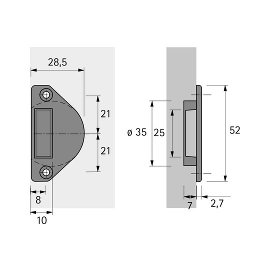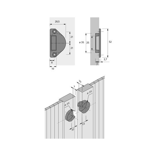 Rechts oder links verwendbar, Zum Einlassen in eine 35 mm Bohrung, Wahlweise zum Einschließen oder bei herausgeschlossenem Riegel zum Einschnappen, Stahl vernickelt